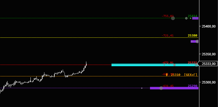 - Por encima del Zero Gamma → entorno estabilizador, volatilidad comprimida, el precio tiende a volver al rango